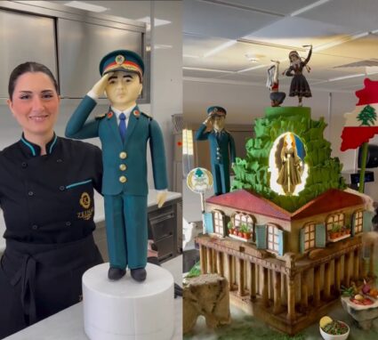 Zeina decided to pay tribute to Lebanon following the election of Joseph Aoun by creating a stunning cake that represents the country’s beauty, tradition, and culture. The base of the cake features the Baalbek Temple, with a traditional Lebanese house on top. Lebanese people in traditional dress are depicted dancing to Fairouz’s music. The cake also includes references to Lebanon’s food heritage, such as Kebbe Nayye and Tabbouleh, and to its cultural heritage with the Raouche Rock. A statue of the newly elected president, Joseph Aoun, stands next to the cake, alongside a Lebanese-map-shaped cake.