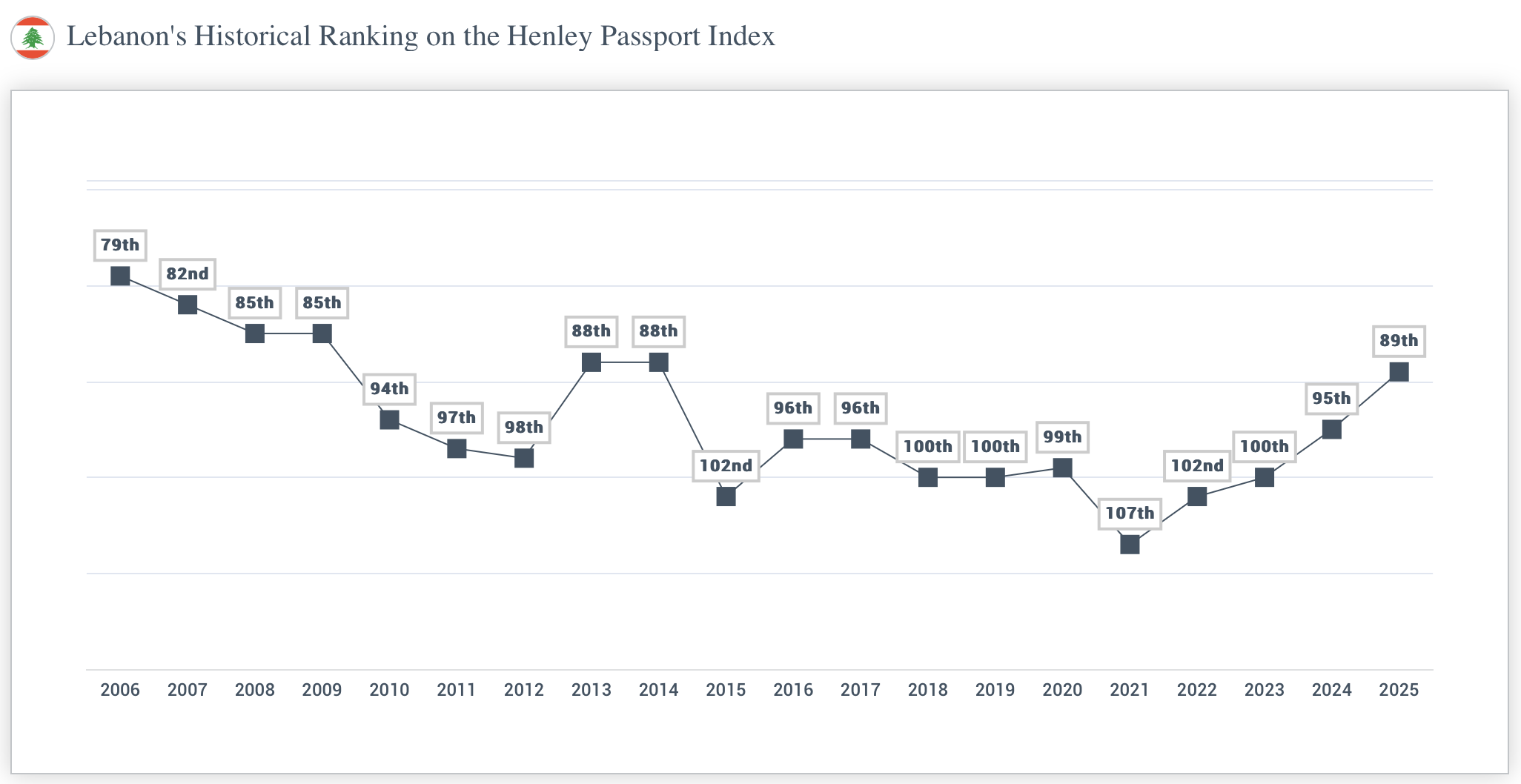 The Lebanese passport ranking has significantly improved since 2024, climbing from the 95th spot to the 89th, almost matching its highest ranking in the past 15 years, which was 88th in 2013 and 2014. The Henley Passport Index ranks passports around the world and is based on exclusive data from the International Air Transport Association (IATA) – the largest and most accurate travel information database – and enhanced by Henley & Partners’ research team.